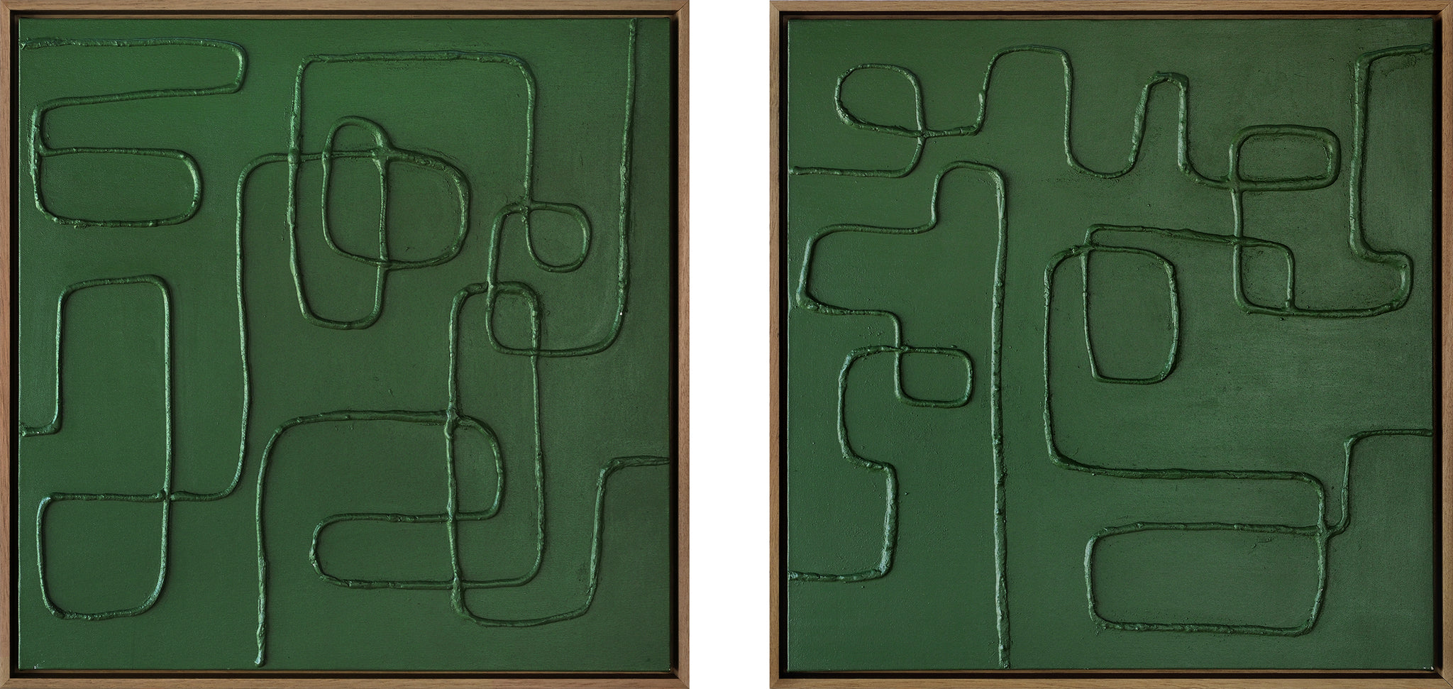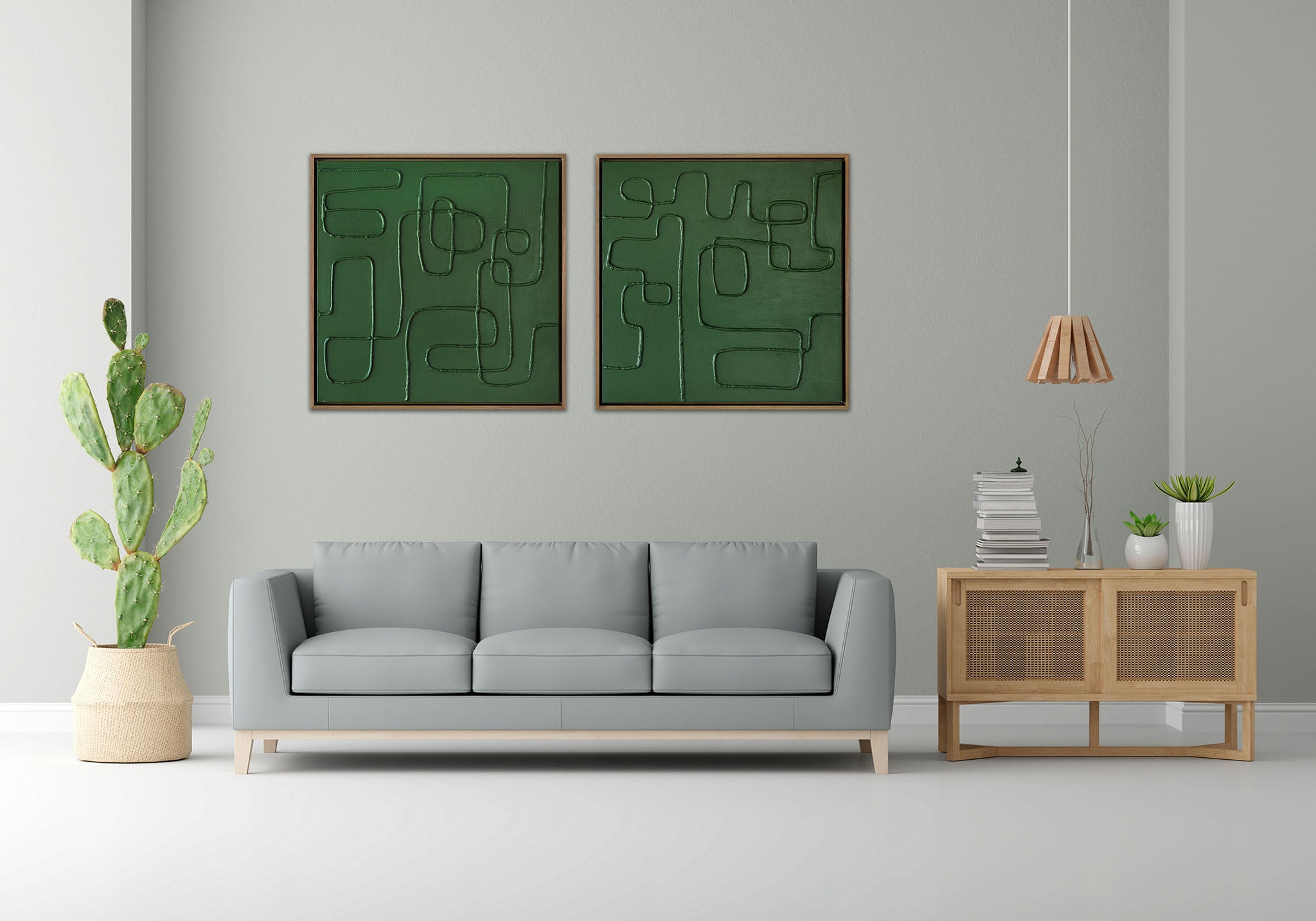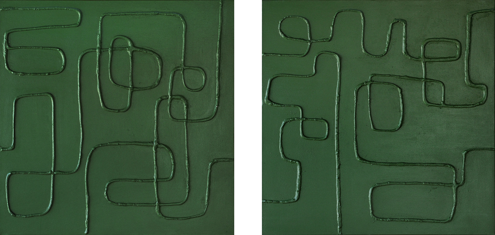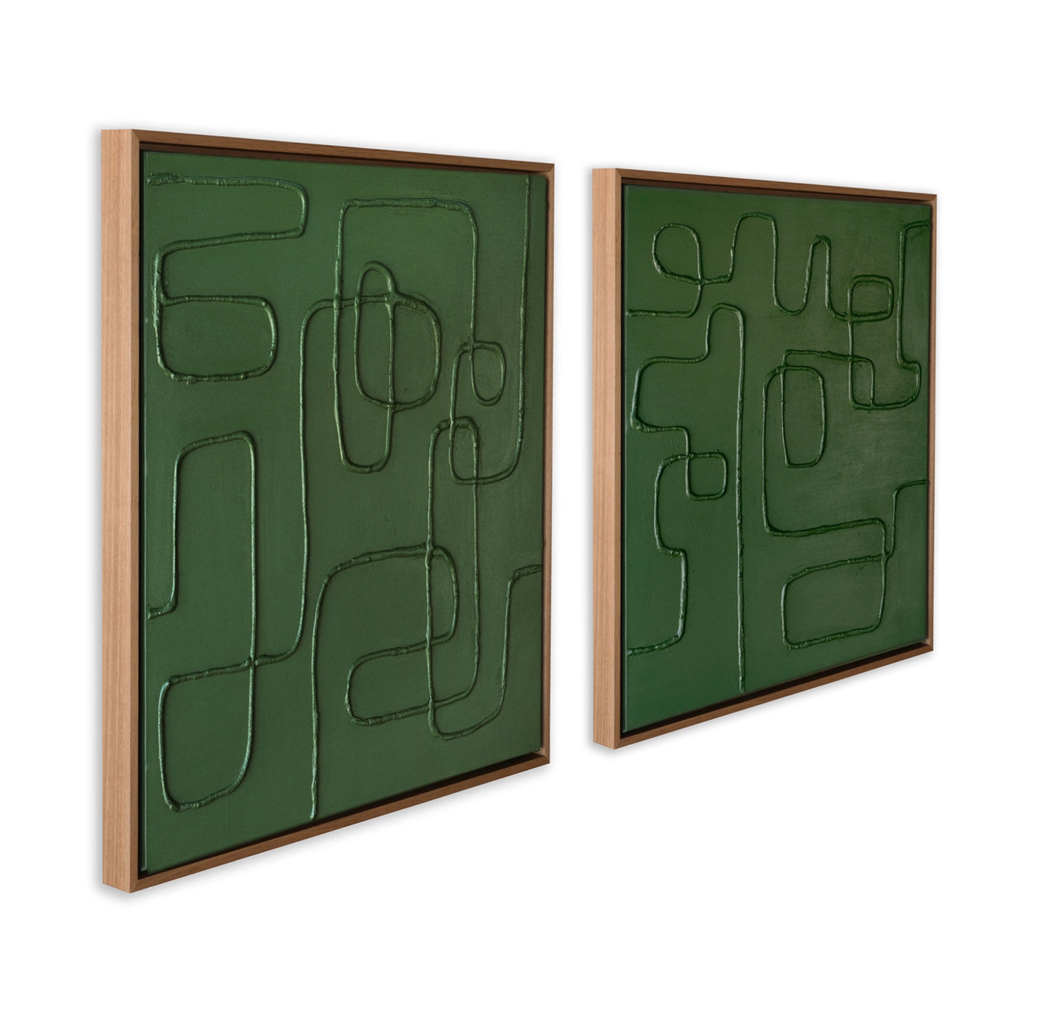 A monochromatic green canvas features raised, curving lines forming an abstract, maze-like design. The textured surface plays with light and shadow, adding depth. Framed simply, the piece highlights form and tactility. Its minimalist aesthetic invites quiet contemplation, focusing on the interplay of line and surface.