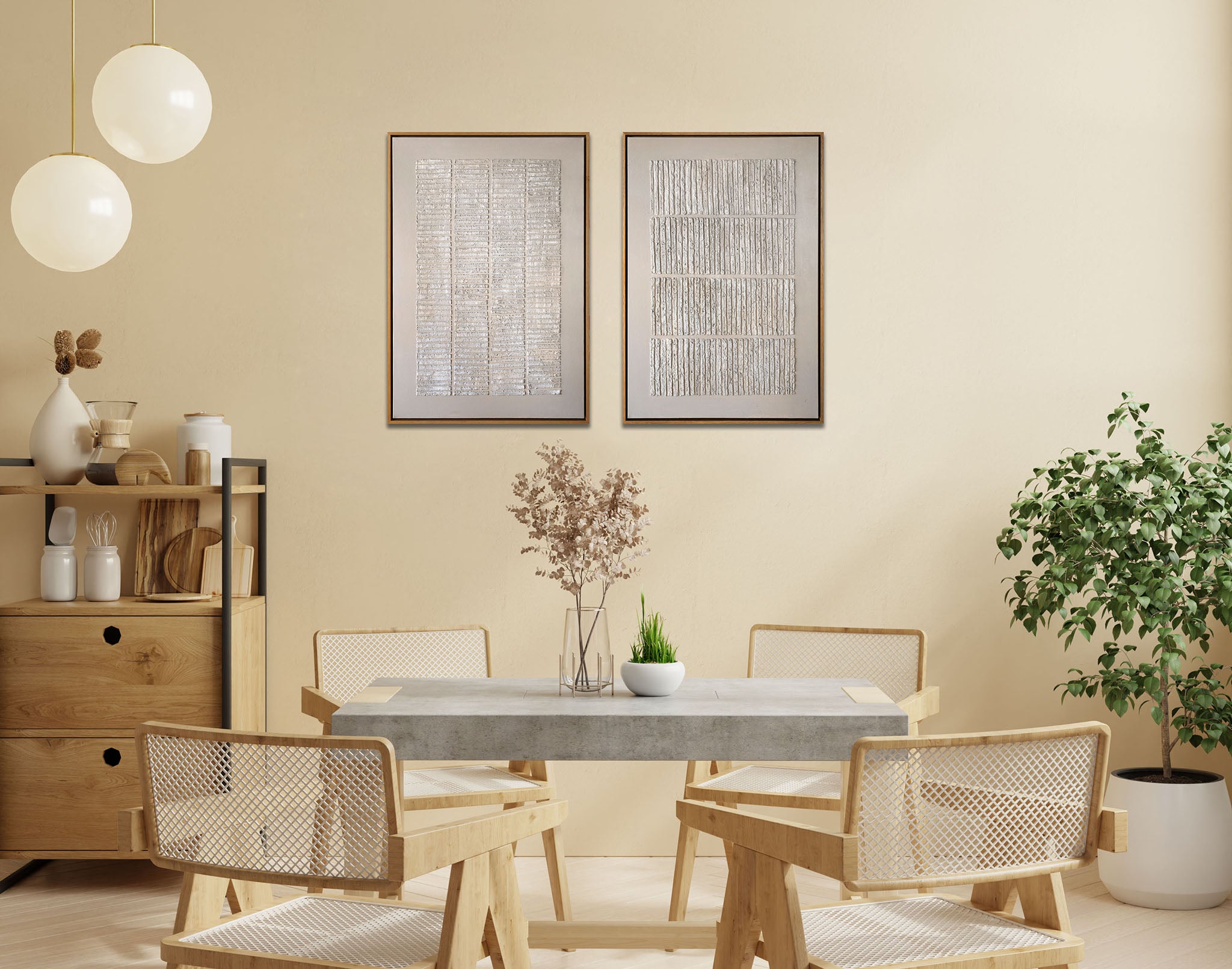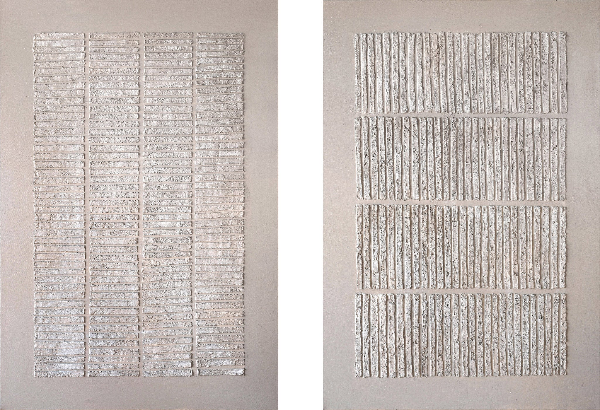 This contemporary mixed media diptych presents a textured, minimalistic composition. Vertical lines, meticulously gridded, create a rhythmic visual pattern across both pieces. A neutral grey palette enhances the tactile surface, with subtle tonal variations adding quiet complexity. Simply framed, the artwork emphasizes understated elegance and a contemporary aesthetic. The structured lines highlight the interplay of light and shadow, inviting calm reflection on their clean design and subtle details.