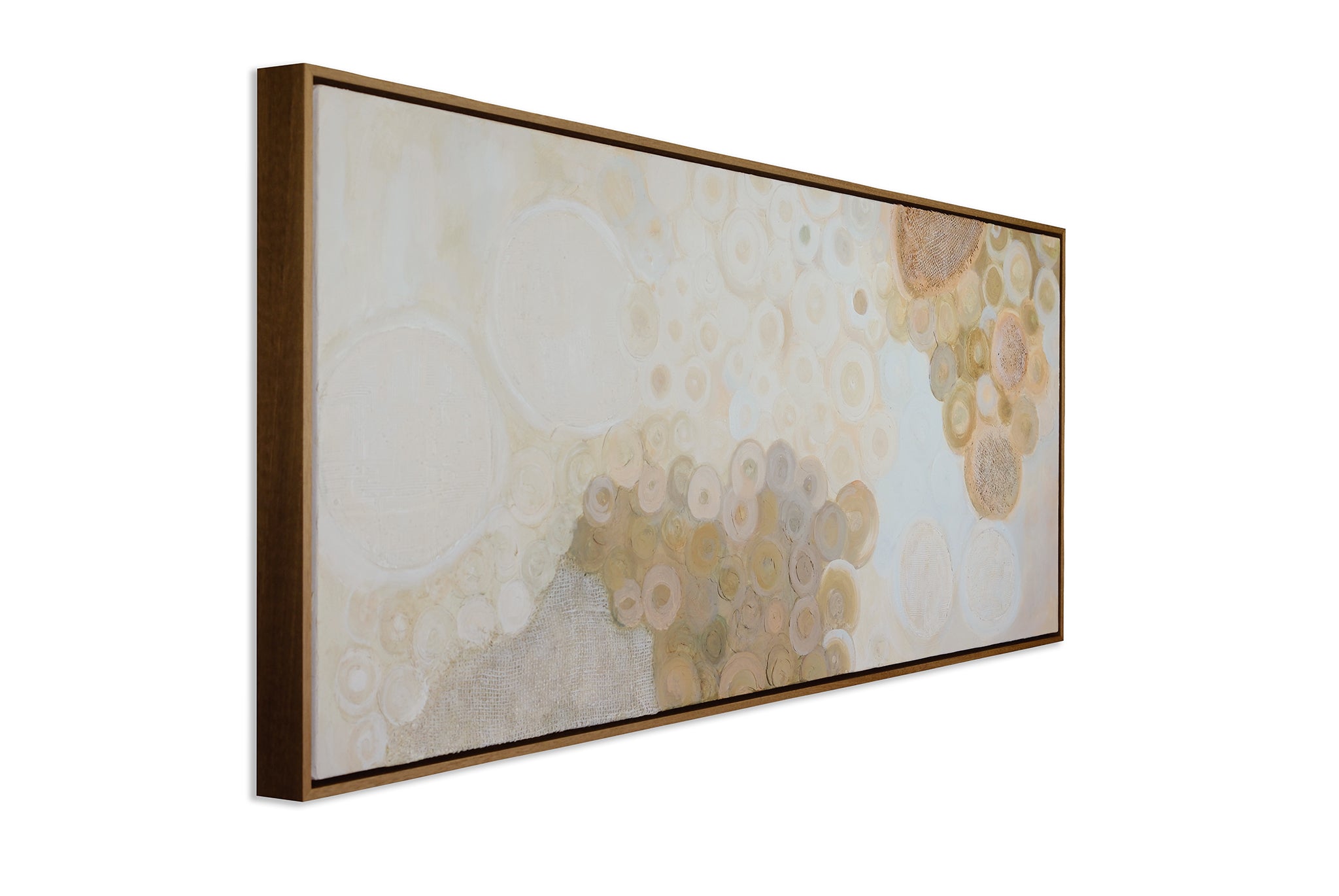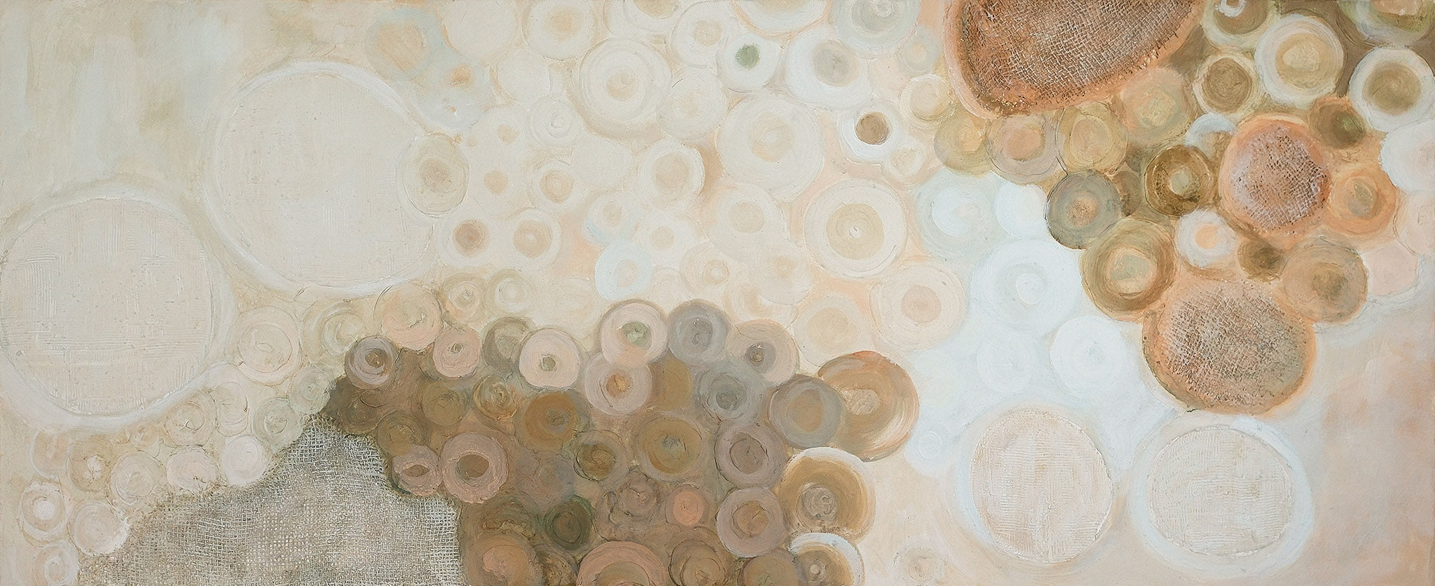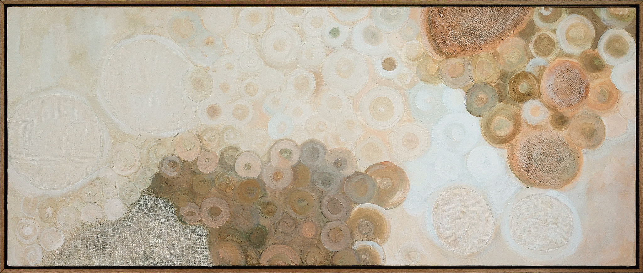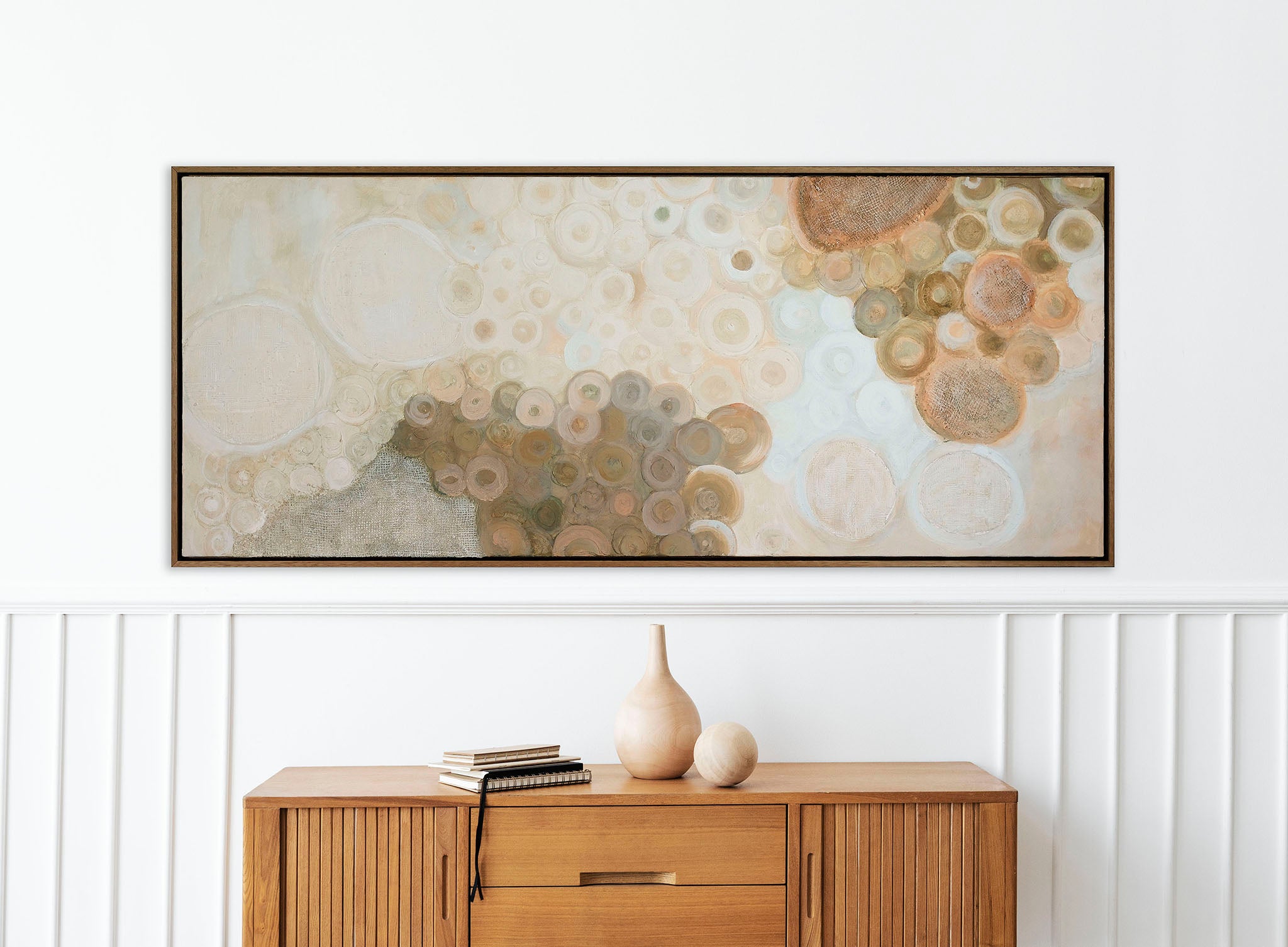 | This abstract artwork features an Organic Abstract style, characterized by a repetition of layered, textured circles. The warm, earthy palette of creams, soft whites, and varying shades of brown/taupe creates a tranquil, sophisticated feel. It enhances a contemporary minimal interior by adding organic texture and a soft, natural warmth, serving as a calming focal point that introduces depth without visual clutter. |