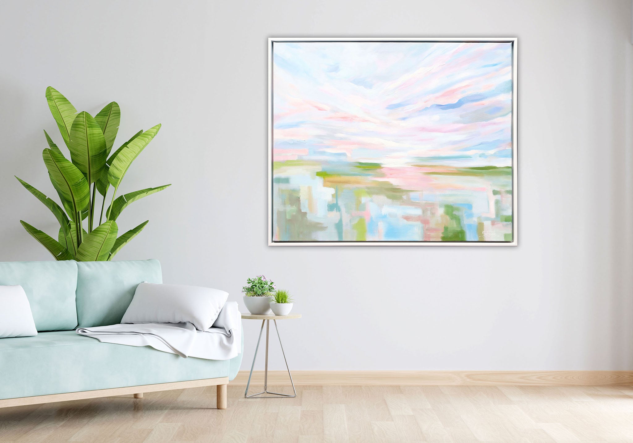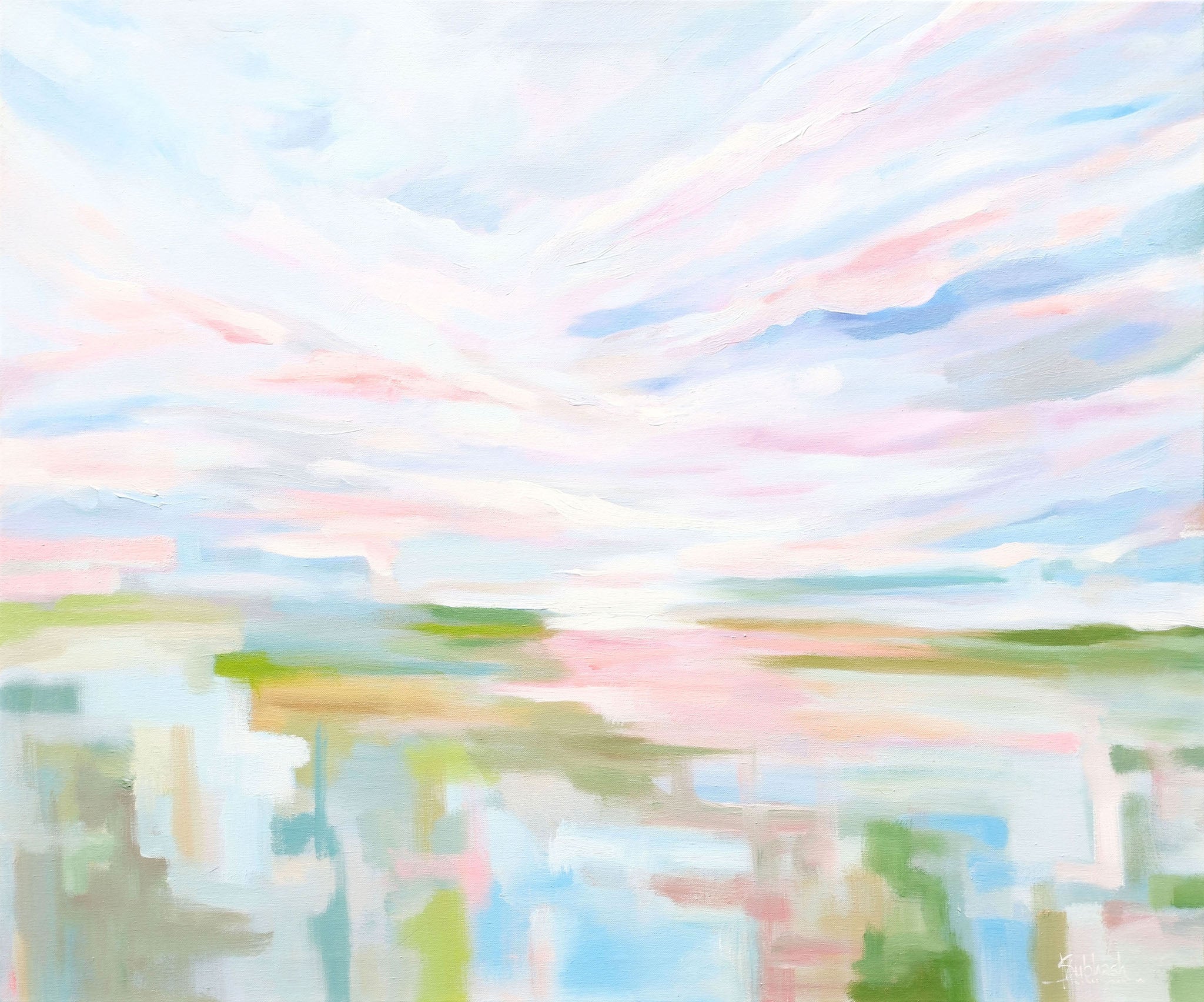 This painting captures a serene landscape, seemingly at golden hour. Soft washes of pale pink, blue, and white blend across the sky, suggesting gentle hues. Below, horizontal strokes of muted greens, yellows, and reflecting pastels depict water and land, creating a tranquil and luminous atmosphere. Visible brushstrokes add movement and texture to the peaceful scene.