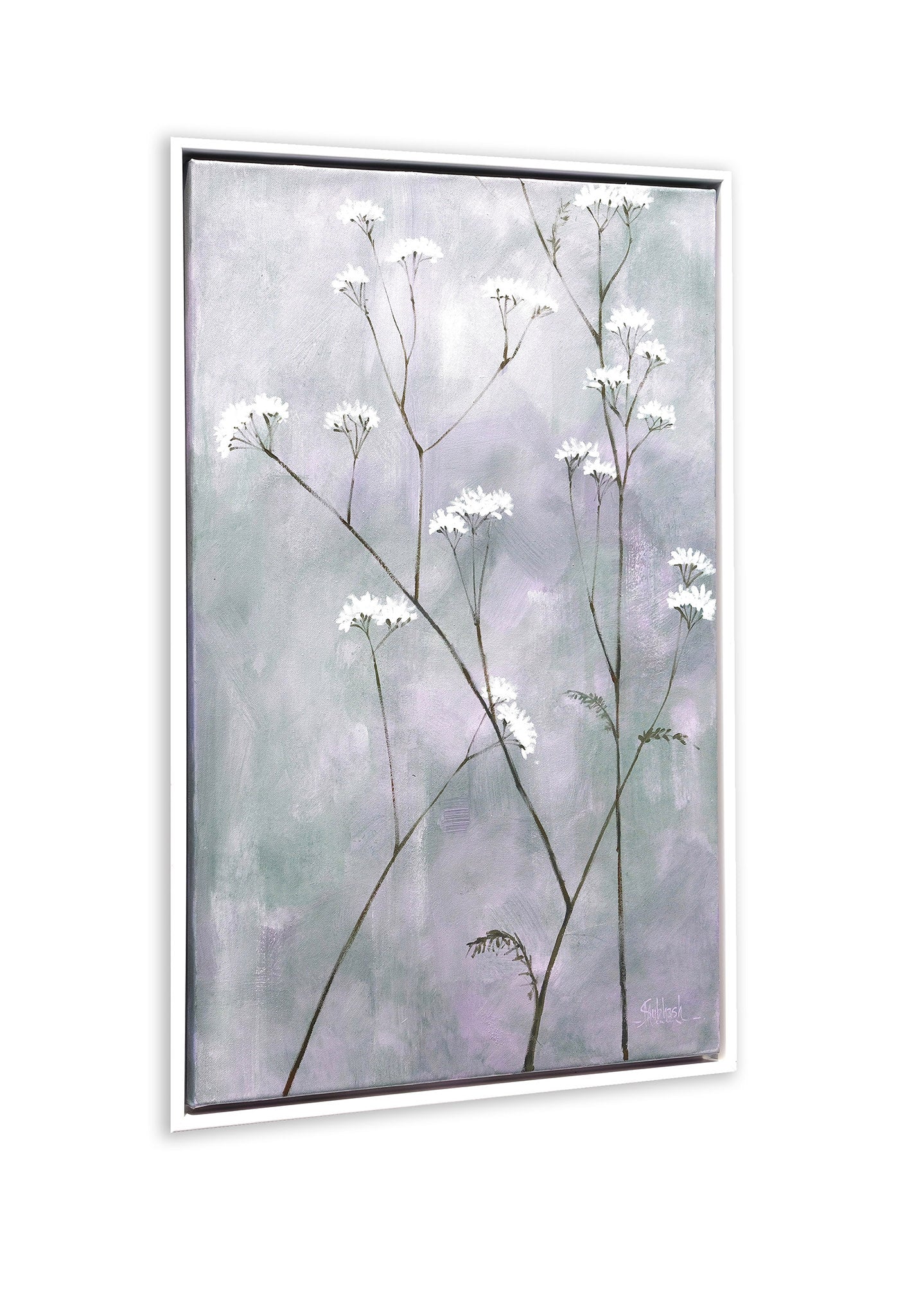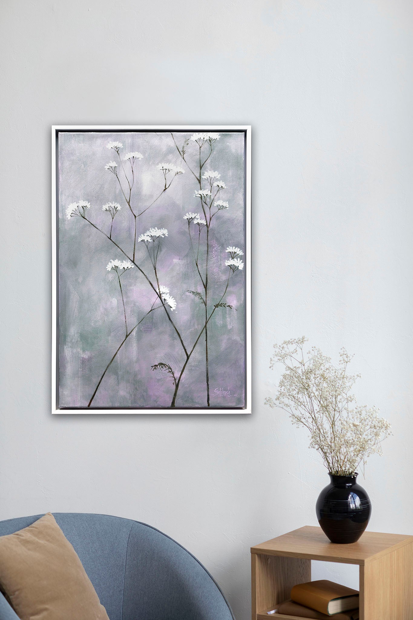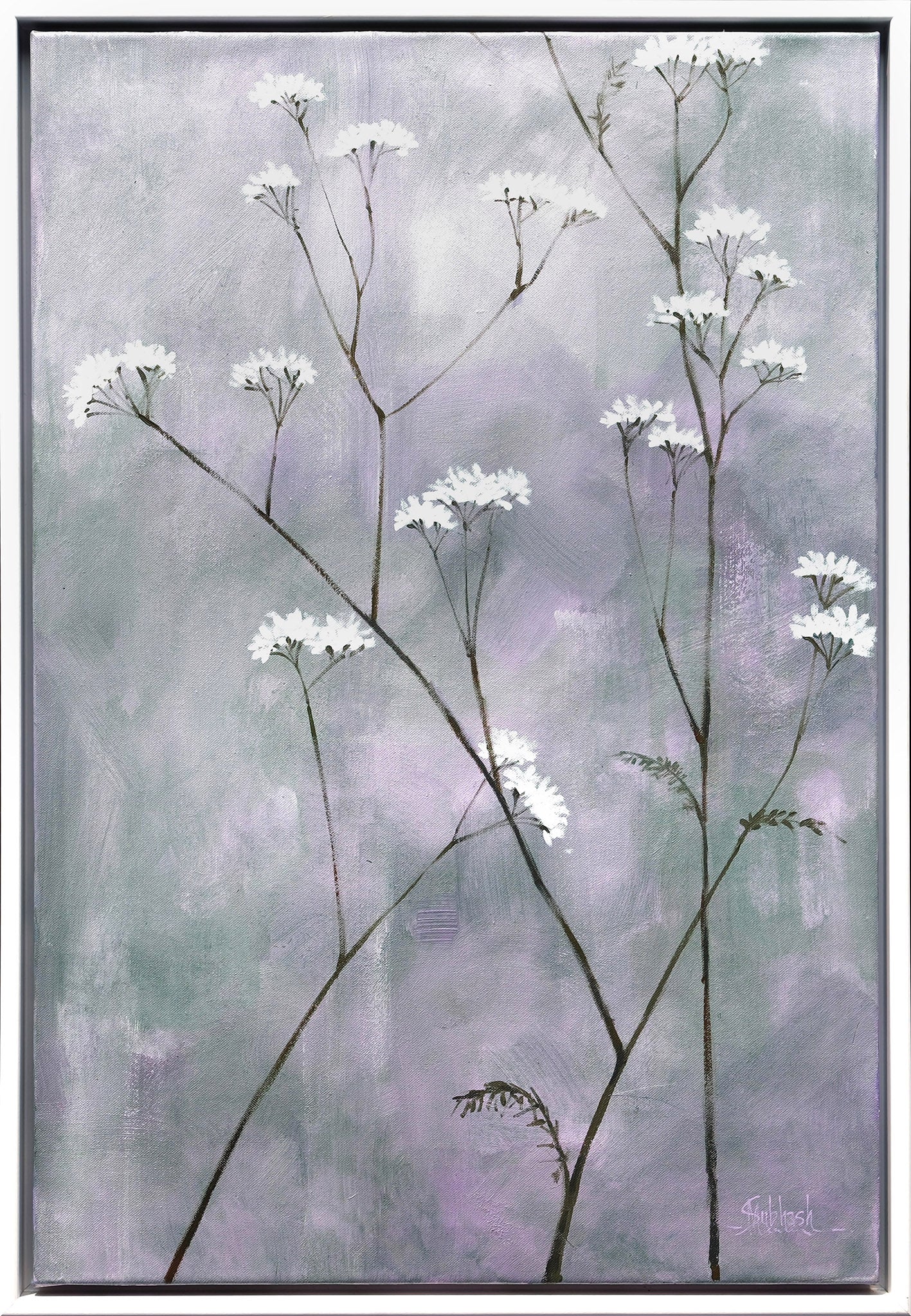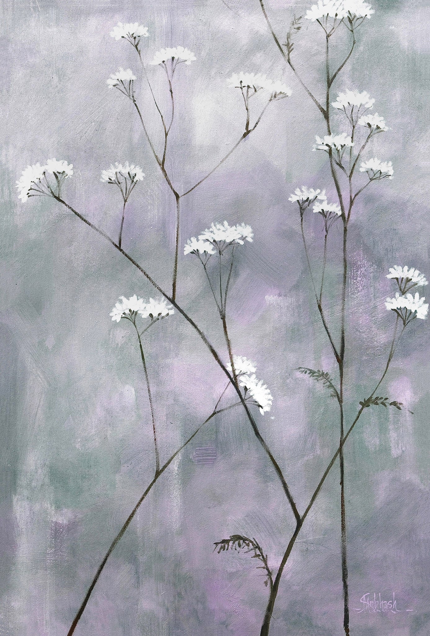 This painting captures a delicate cluster of white Queen Anne's Lace flowers against a softly blurred, atmospheric background of muted purples and grays. The slender, branching stems of the wildflowers rise and intersect across the canvas, their tiny, intricate white blooms forming delicate, lace-like patterns at their tips. The background's blended washes of color create a dreamy, ethereal quality, pushing the foreground flowers into gentle focus. The overall mood is serene and elegant, highlighting the fragile beauty of these wild blooms.