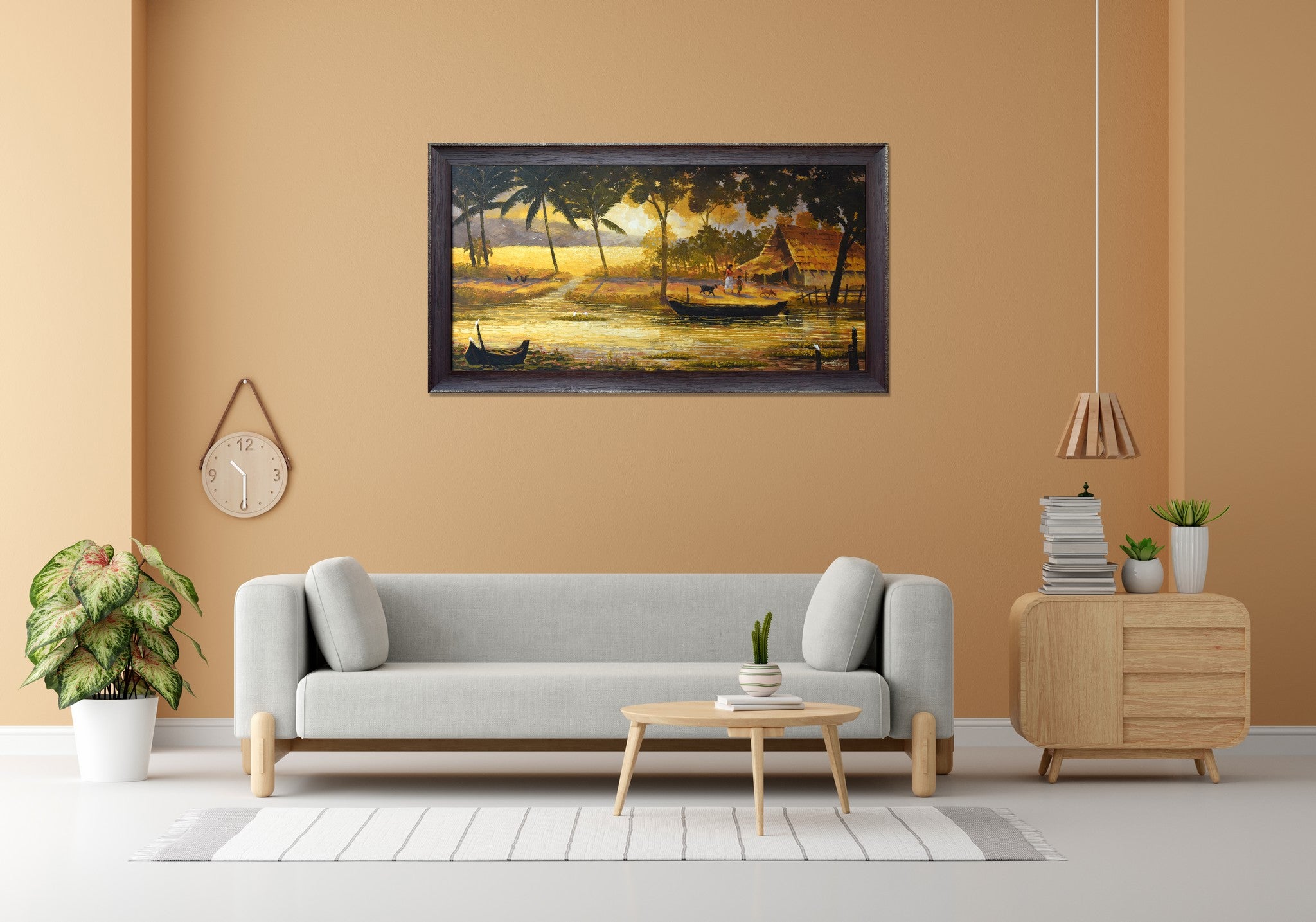 Immerse yourself in the warmth of golden sunlight as it bathes a serene village scene. This beautiful landscape painting captures the peaceful essence of a thatched hut beside a calm river, with palm trees swaying gently and a boat floating tranquilly on the water. The harmonious blend of warm hues and soft brushstrokes evokes a sense of peace and nostalgia, making it an ideal choice for home decor, offices, or meditation spaces.