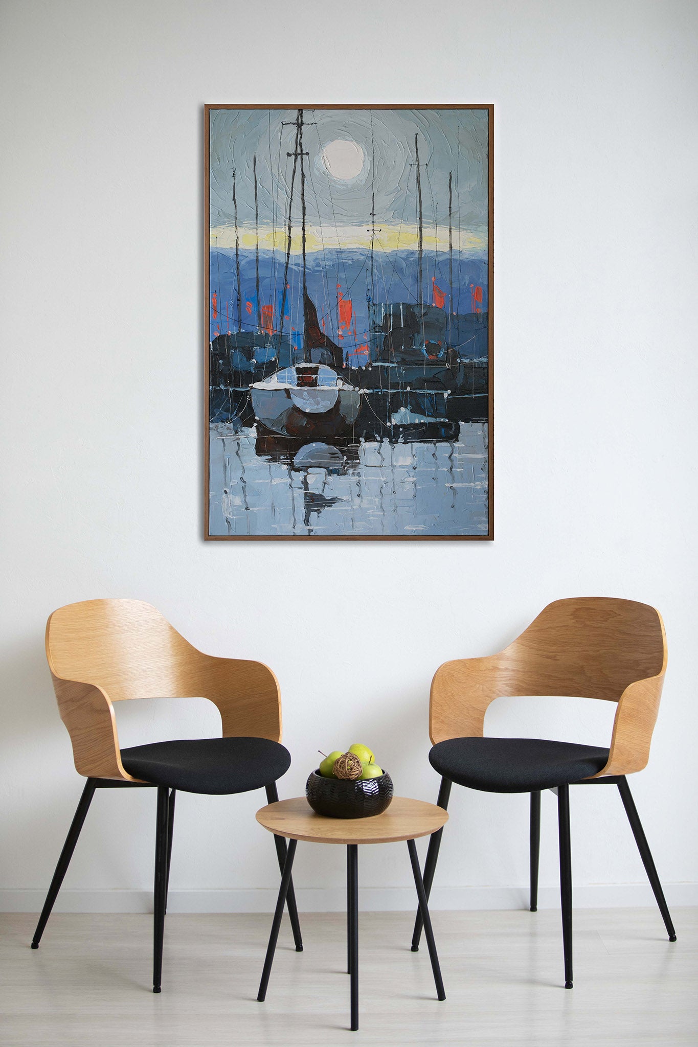 This painting depicts a harbor scene with sailboats, rendered in a textured, impressionistic style. The sky, a pale blue, fades towards a bright, circular moon or sun. Tall masts rise from the dark, indistinct shapes of the boats, accented by small, vibrant red flags. The foreground features a light-colored boat, its reflection visible in the water. The overall palette is muted, with blues, grays, and hints of yellow, creating a serene, almost dreamlike atmosphere. The brushstrokes are visible, adding depth and a sense of movement.