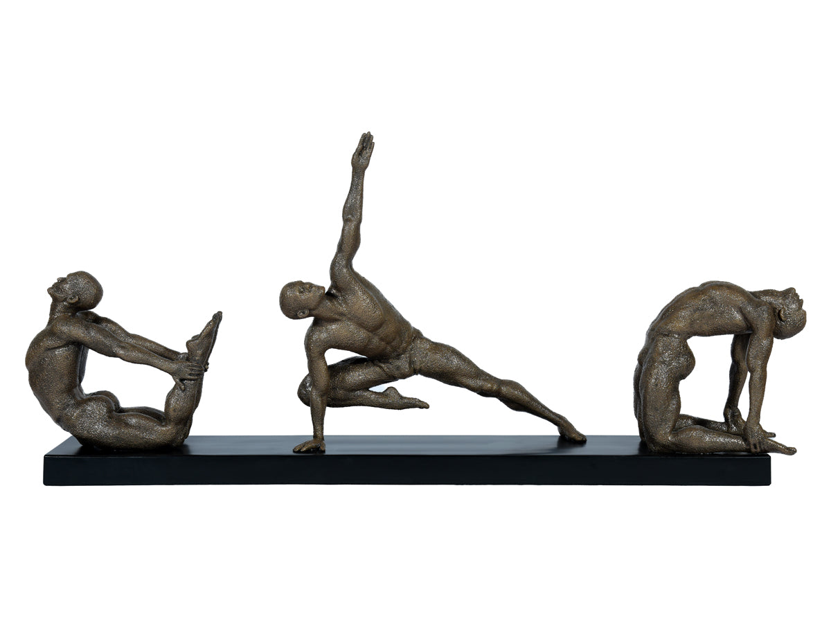 The sculpture depicts three male figures practicing yoga, each captured in a different pose that conveys a sense of calm and serenity. The details of the figures bodies are rendered with great attention to realism, with every muscle and curve perfectly captured in the pose. The figures in the sculpture appear to be in a state of perfect balance and harmony, celebrating the transformative power of yoga.