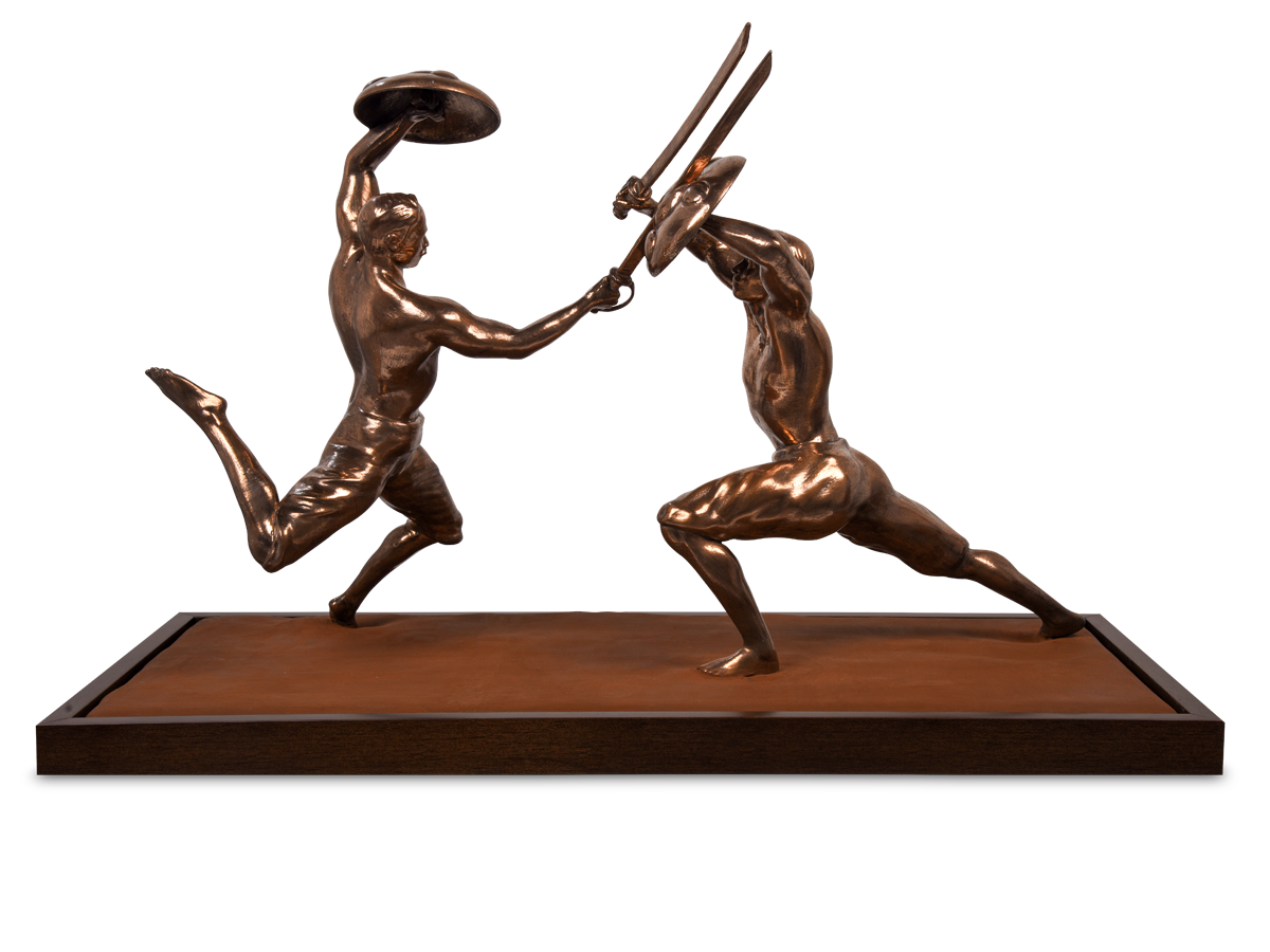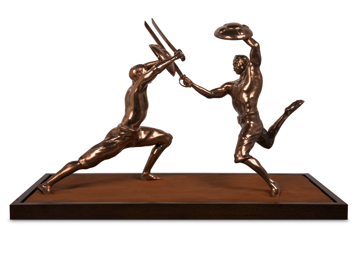 A breathtaking Kalaripayattu sculpture, this piece brings to life two Kalari warriors engaged in an intense sword and shield battle, embodying the discipline, agility, and warrior spirit of Indian martial arts. The aged bronze finish adds depth and character, making it a standout handcrafted masterpiece for collectors of combat sculptures, warrior figurines, and cultural heritage art.