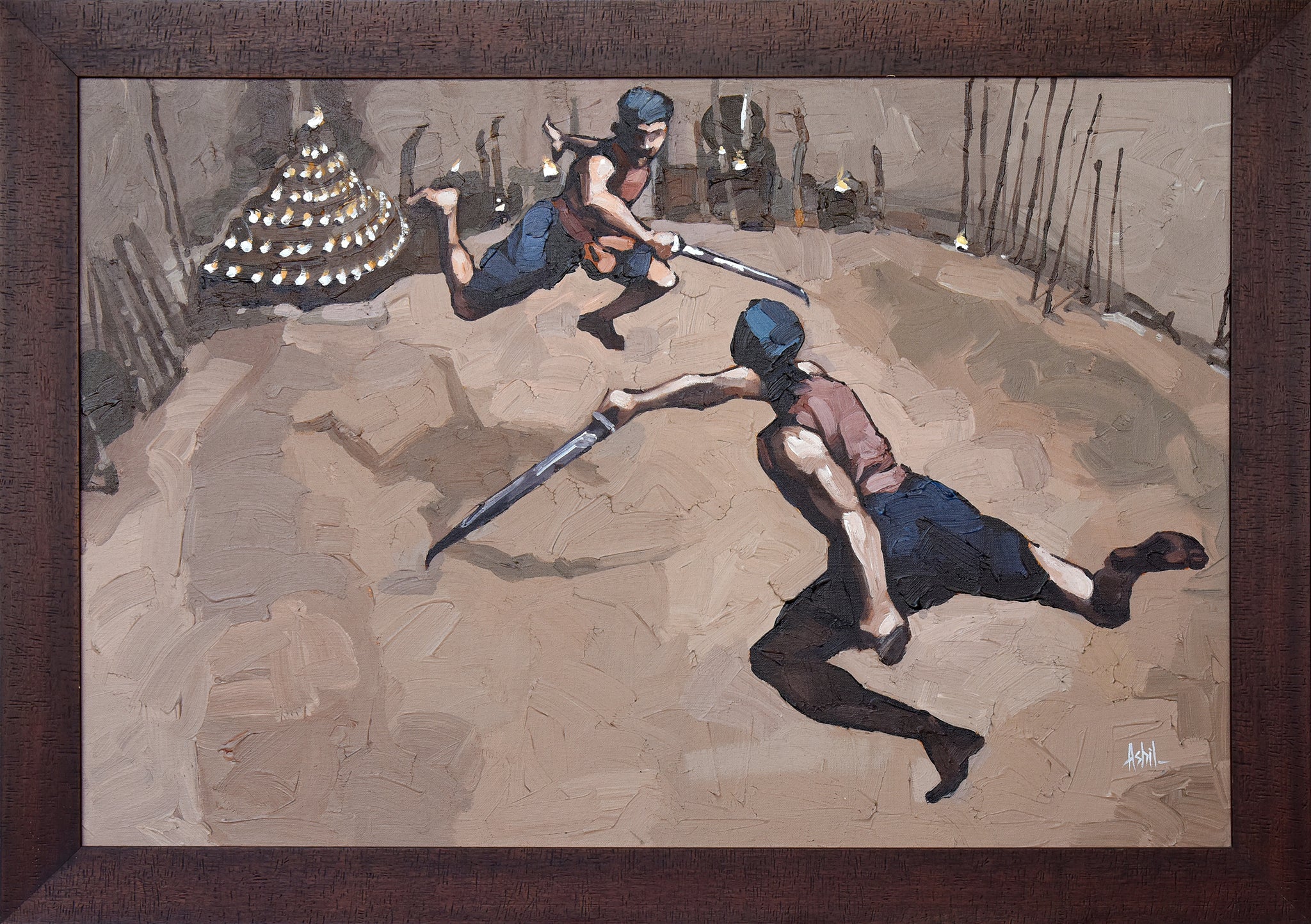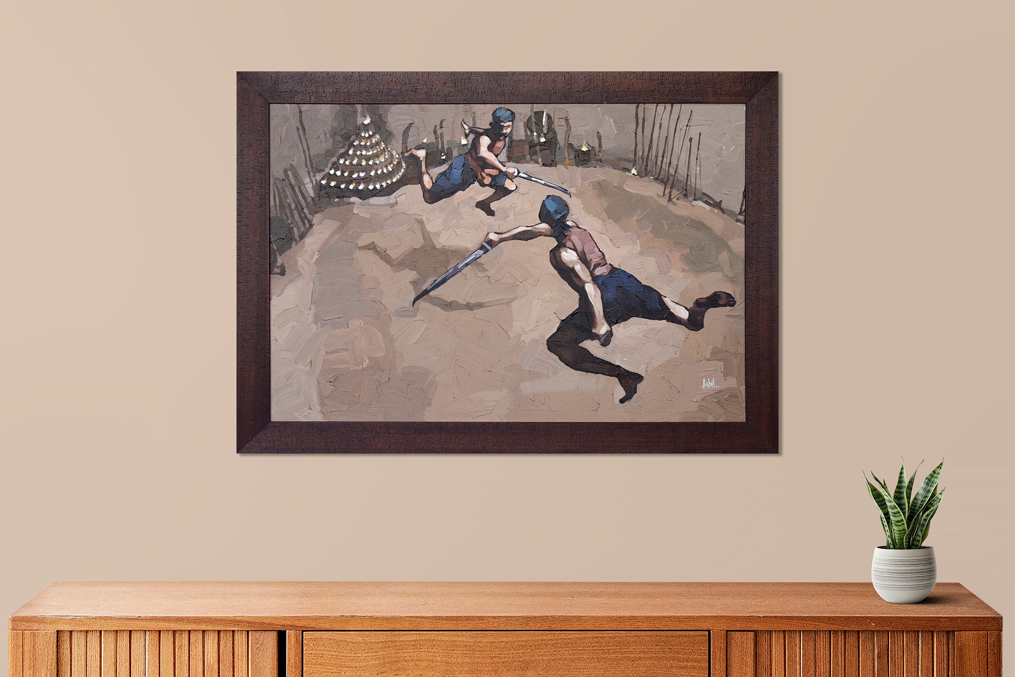 A striking depiction of Kalaripayattu, India's ancient martial art, captured with bold strokes and dynamic movement. The raw energy and earthy tones create an immersive experience, making this piece an inspiring focal point for spaces that thrive on power, discipline, and cultural heritage.