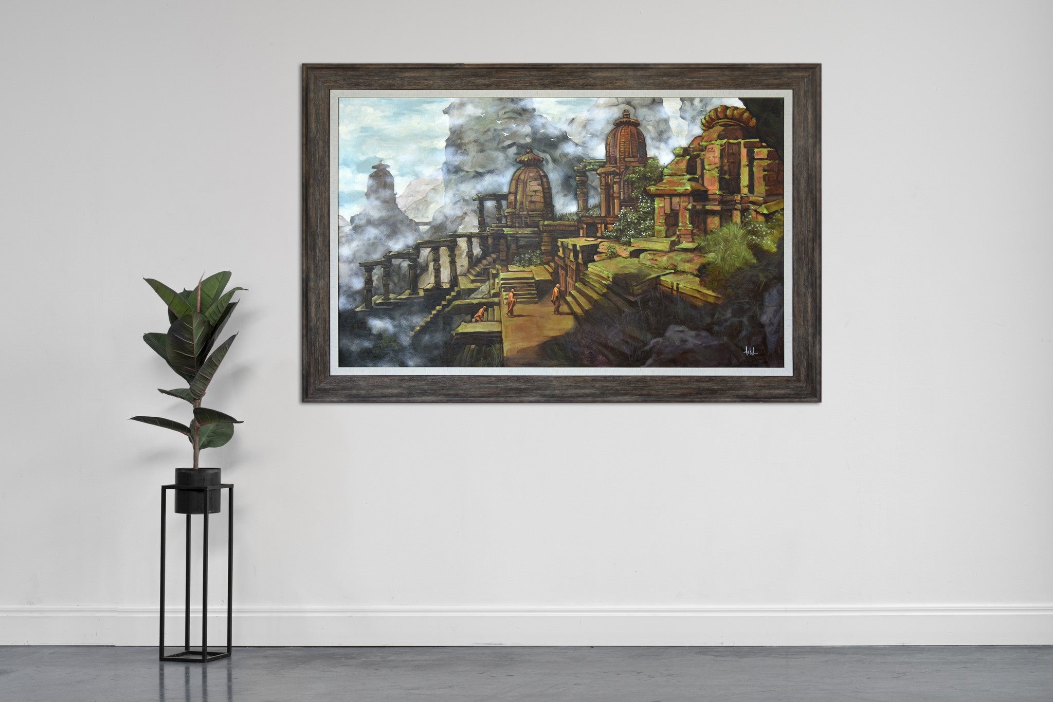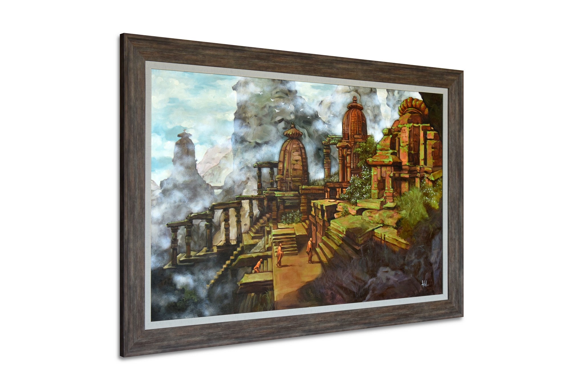 This acrylic on canvas painting captures the grandeur of the Kalinga Temple, a testament to ancient architecture, spiritual devotion, and the mysteries of time. The intricate details and atmospheric composition evoke the human quest for meaning, connection, and the sacred. A captivating piece for collectors of temple art, heritage paintings, and cultural masterpieces that celebrate India’s architectural legacy.