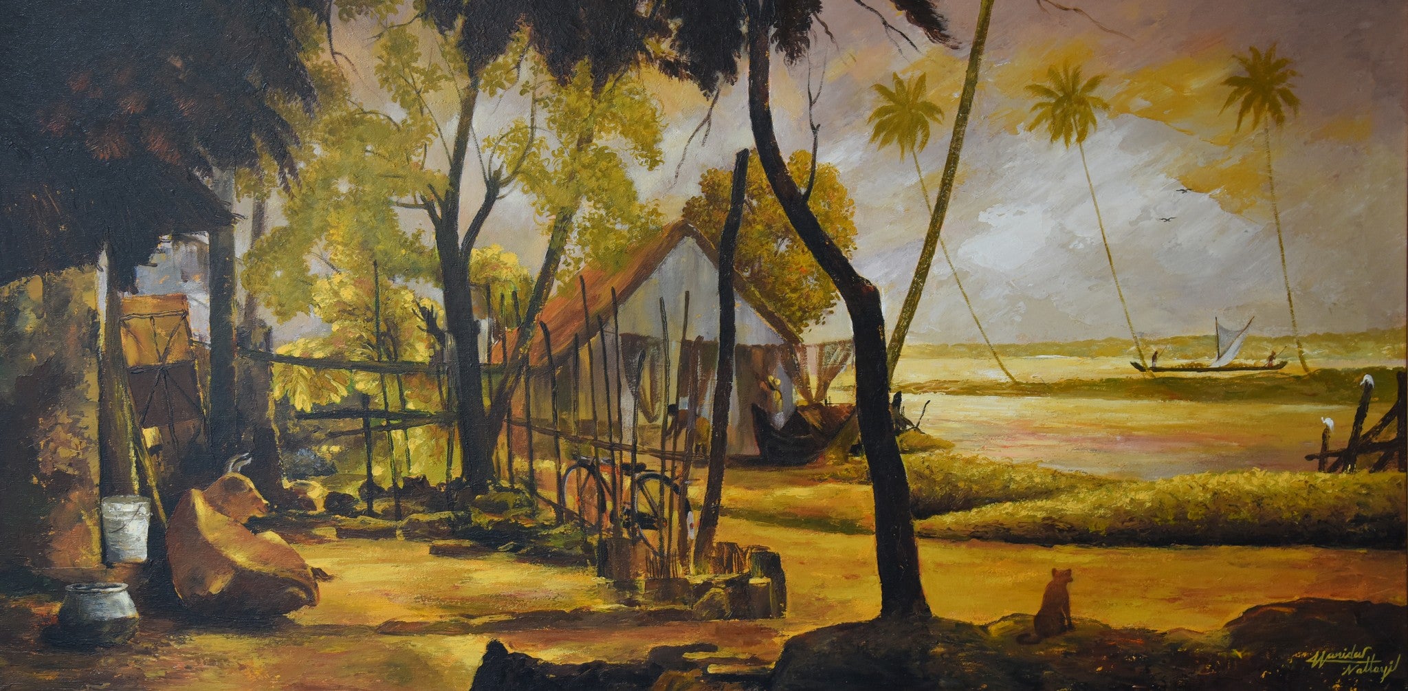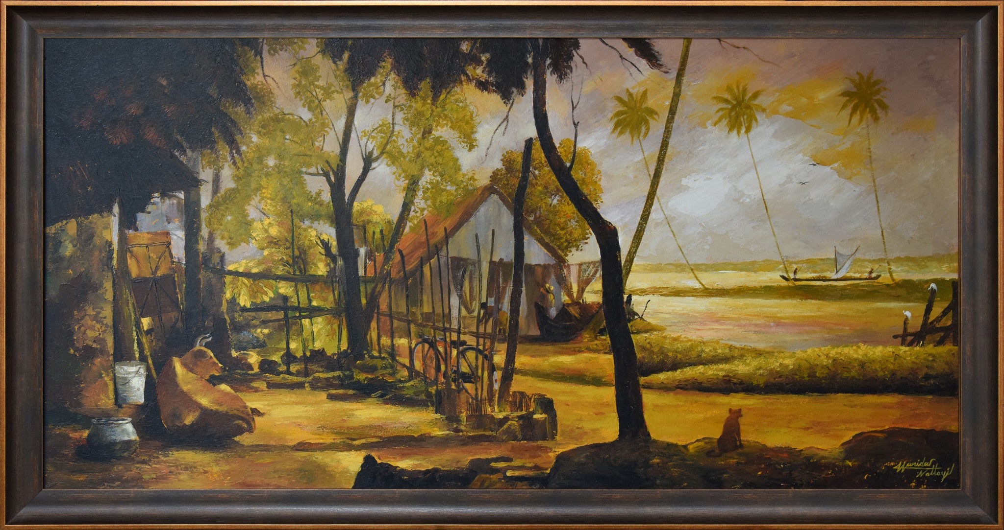 Painting depicting a tranquil riverside scene with a quaint hut nestled amongst lush greenery. A boat glides across the calm waters, while palm trees sway in the gentle breeze.