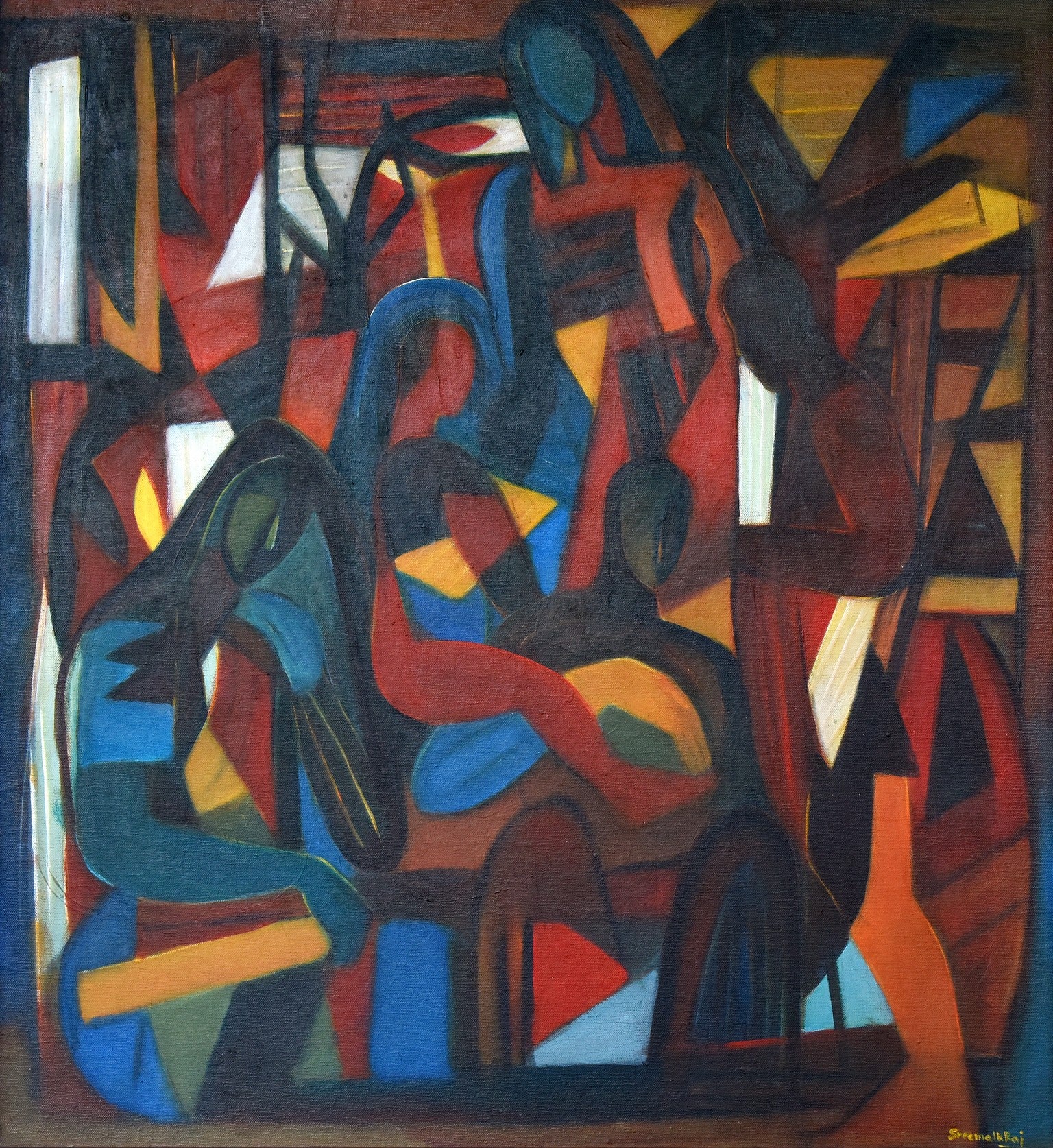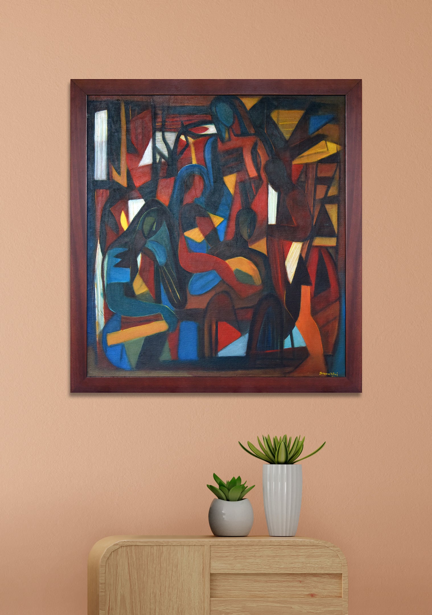 A striking abstract painting depicting human figures through geometric shapes and a muted yet expressive palette. The composition, dominated by warm hues of red and brown, creates a sense of intimacy and introspection, inviting the viewer to explore deeper emotional connections. This modern art piece blends contemporary aesthetics with a thought-provoking narrative, making it a perfect addition to living rooms, offices, galleries, or creative spaces.
