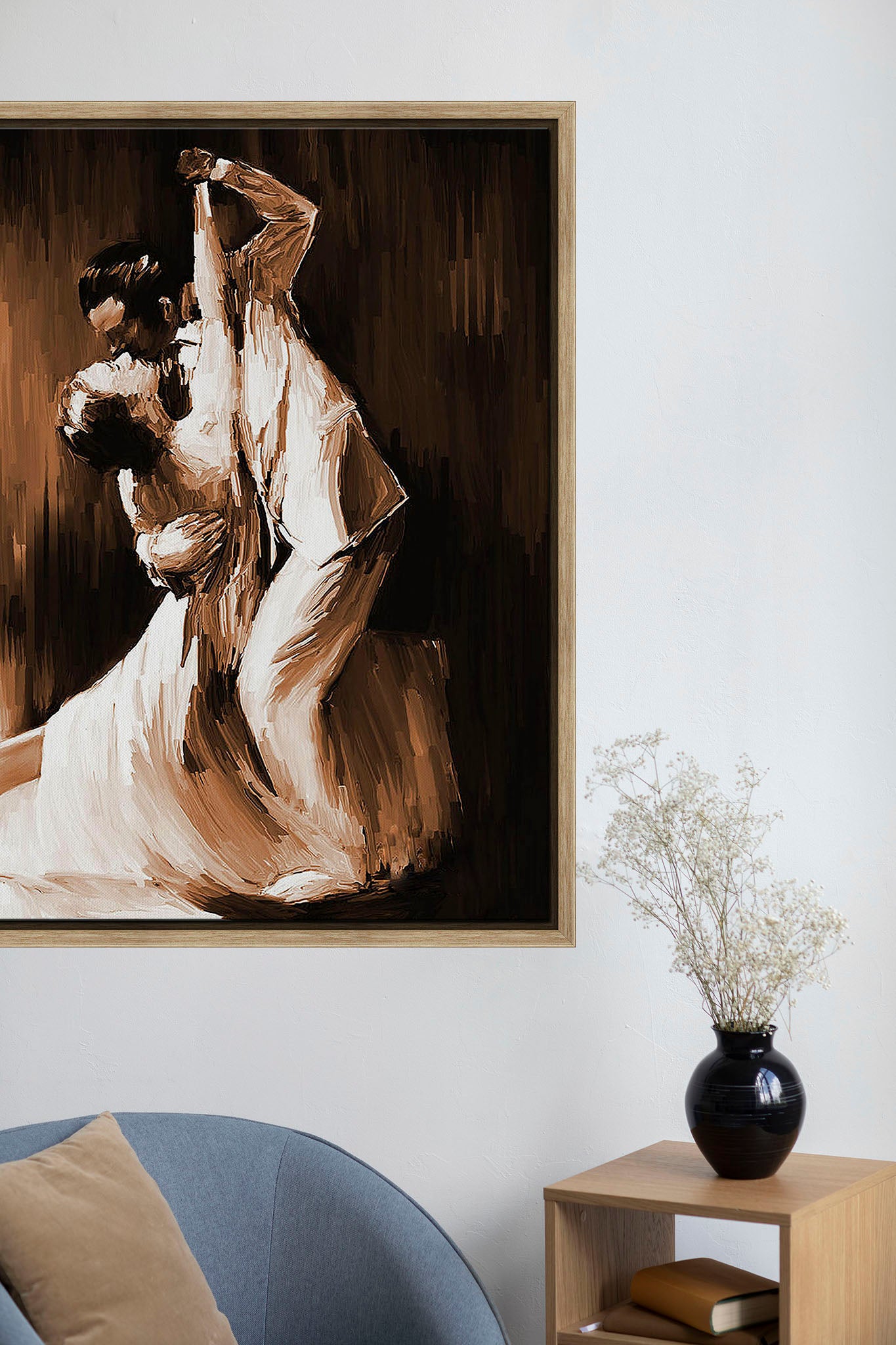 A mesmerizing digital brushstroke painting that captures the intensity and romance of the tango. The sepia-toned palette adds a timeless elegance, emphasizing the grace, passion, and connection between the dancers. Perfect for lovers of dance, romance, and dramatic art, this piece brings movement and depth to any space.